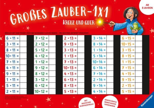 Spielerisch das große Einmaleins üben, wiederholen und sich einprägen! Das Ergebnis kann mit abwaschbarem Filzstift eingetragen werden. Durch Reiben der schwarzen Fläche erscheint wie von Zauberhand kurz die richtige Lösung, bevor sie wieder verschwindet - einfach magisch!